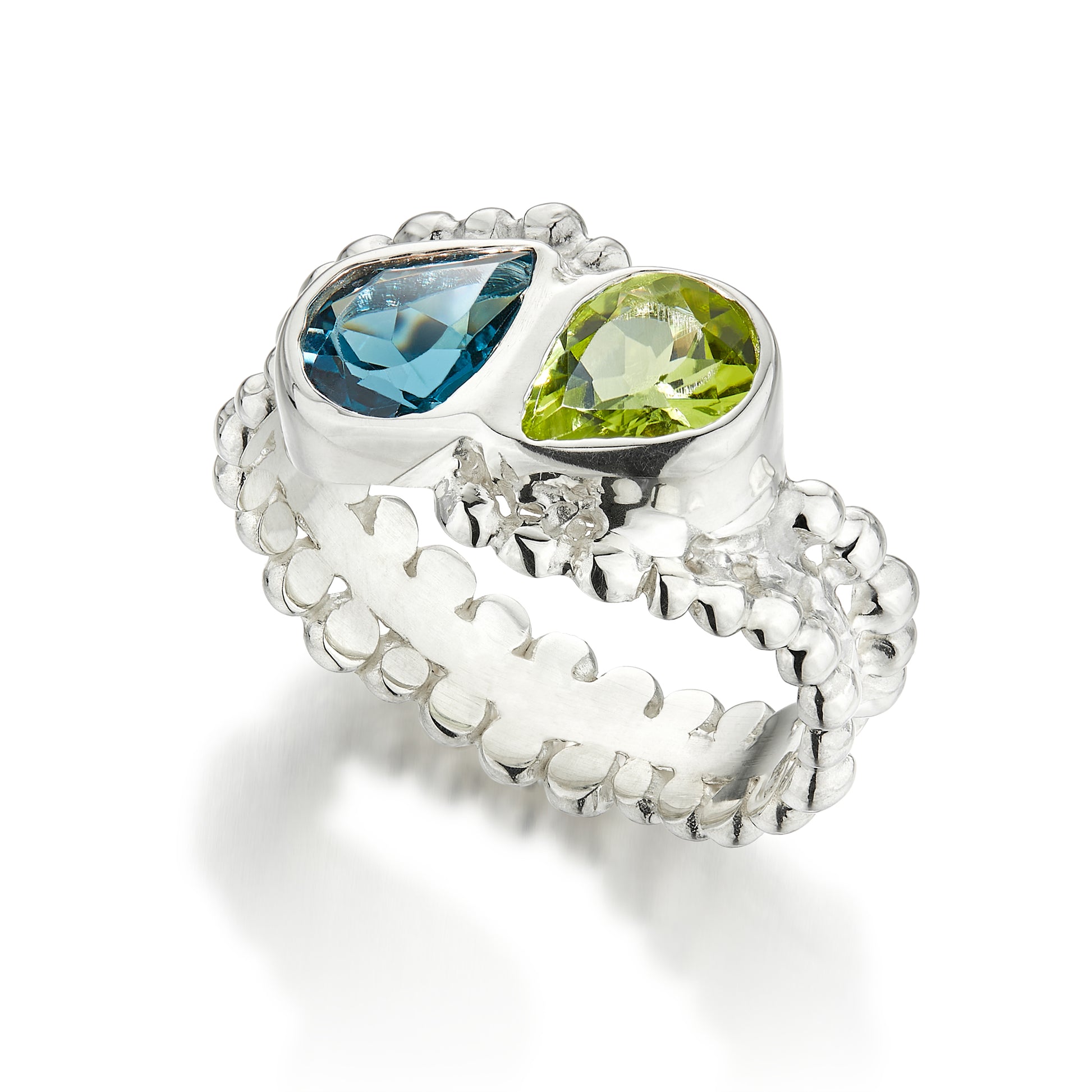 A beautiful 'Toi et Moi' (you and me) ring with a combination of pear shaped Peridot and London Blue Topaz set in a rub over setting with silver granules incorporated into the design. A nod to the stone textures and ornate carvings at Angkor Wat.